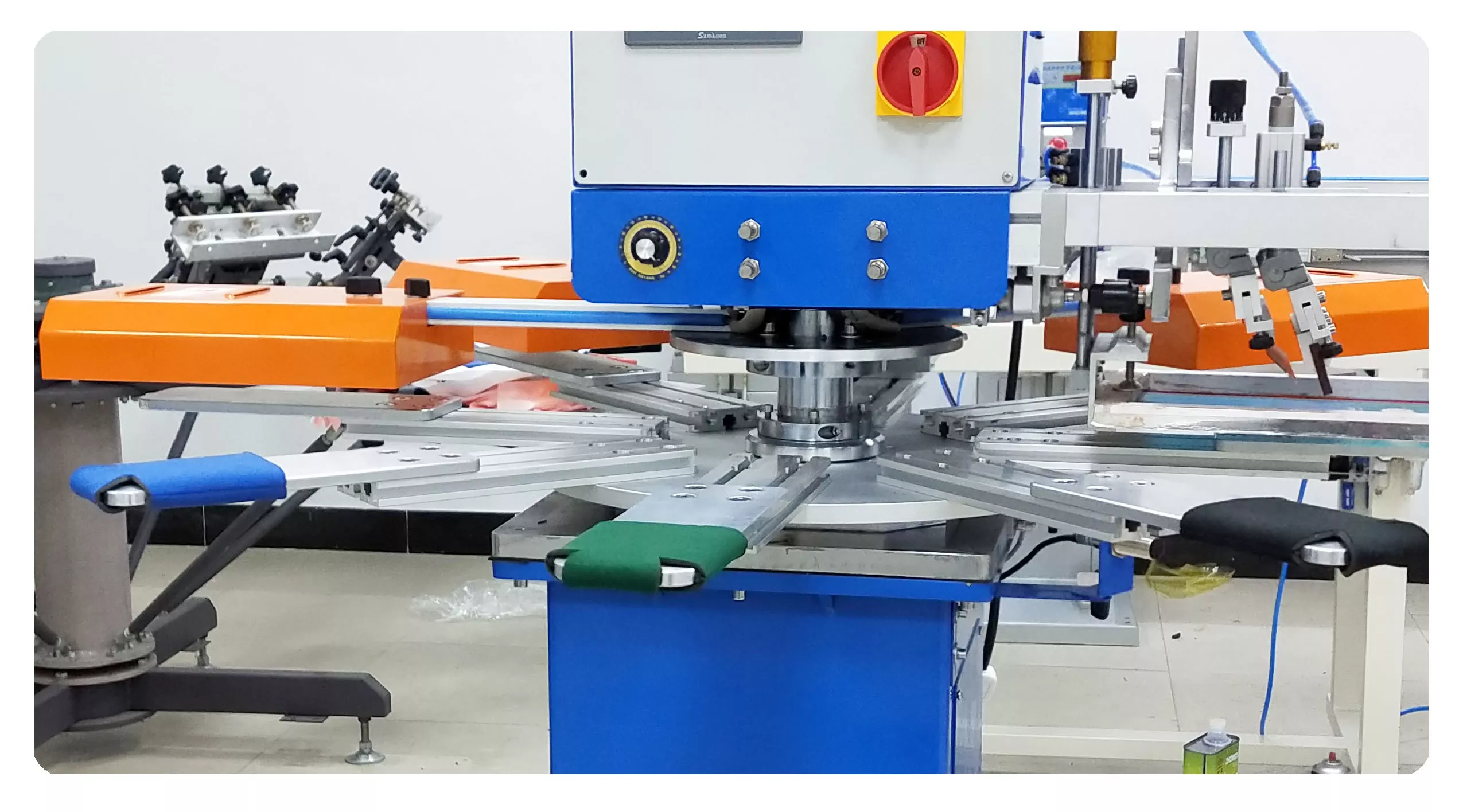 5. Айналмалы жұмыс үстелі сегіз станцияны қамтиды: біреуі жүктеуге, біреуі басып шығаруға, екеуі кептіруге және біреуі түсіруге арналған, бұл бес станцияның бір уақытта жұмыс істеуіне мүмкіндік береді.