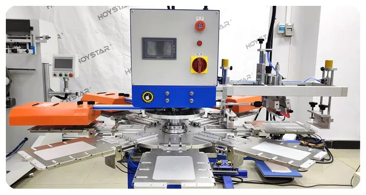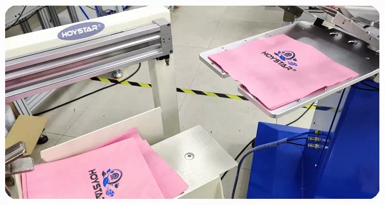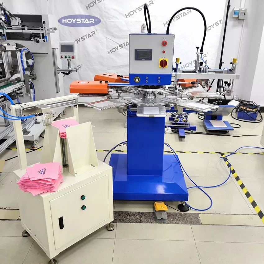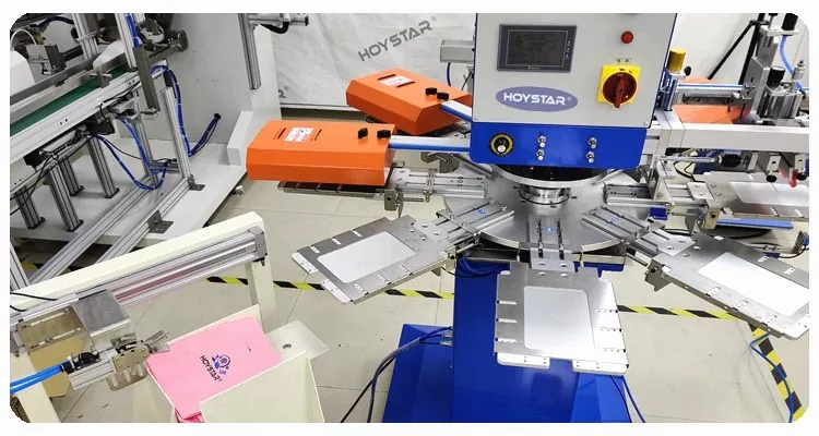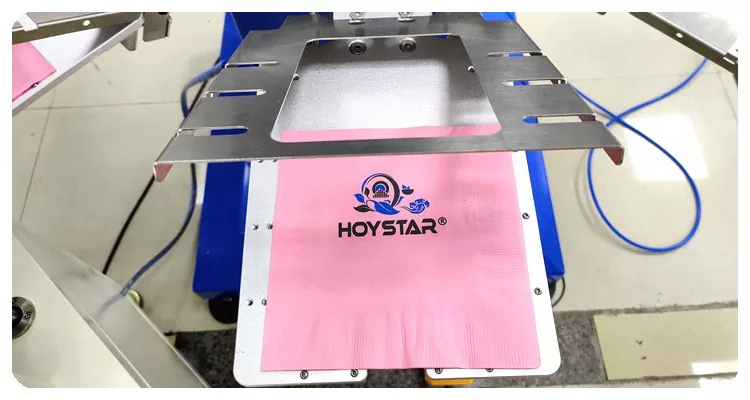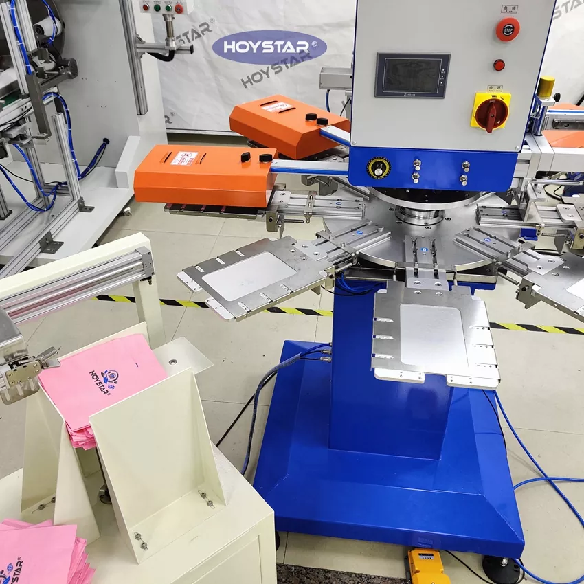 HOYSTAR - Қытайдағы сенімді өндіруші және жеткізуші; Бұл HOYSTAR автоматты 2 түсті салфеткалы экранды басып шығару машинасы майлықтарда толық автоматты басып шығару үшін арнайы жасалған. Оның жеңілдетілген басып шығару процесі келесідей жүзеге асады: майлықтарды машинаға қолмен салу — бірінші түсті автоматты басып шығару — автоматты кептіру — екінші түсті автоматты басып шығару — автоматты кептіру — автоматты түрде түсіру— және өнімді автоматты түрде жинау.