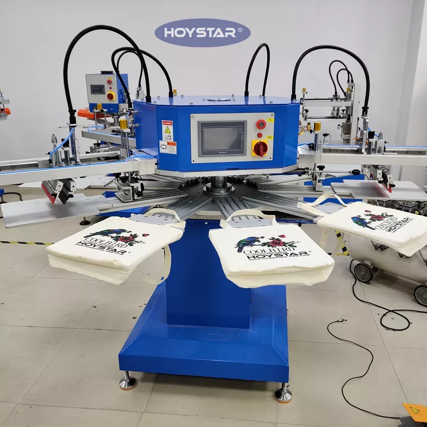 Кәсіби өндіруші және жеткізуші ретінде Бұл HOYSTAR автоматты 4 түсті сөмке футболкаларын экраннан басып шығару машинасы тоқыма өнеркәсібі үшін арнайы жасалған. Сағатына 1200 данаға дейін әсерлі өнімділікпен өндіріс тиімділігін арттыруға болады. Киім белгілерін, жапсырмаларды және сөмкелерді басып шығаруға арналған дизайн әртүрлі өнім түрлерін басып шығаруға арналған арматураны өзгерте алады. Құрылғыда тез және ыңғайлы тиеу мен түсіруге мүмкіндік беретін айналмалы жұмыс үстелі бар — тоқтап қалу уақытын азайтып, өткізу қабілетін арттырады.