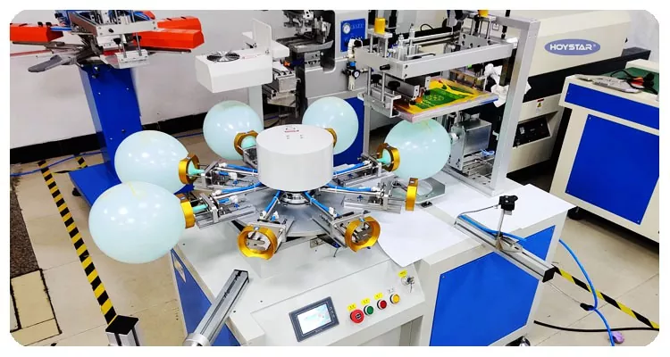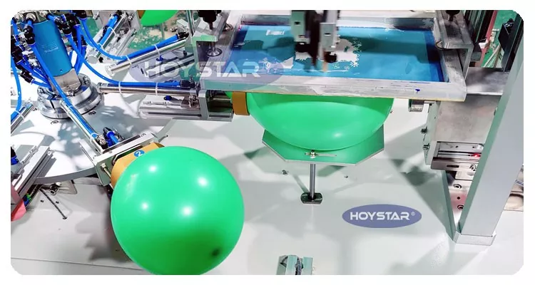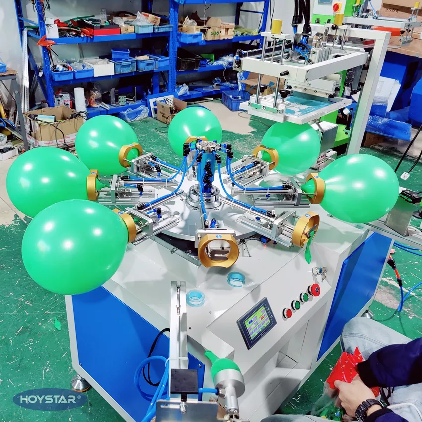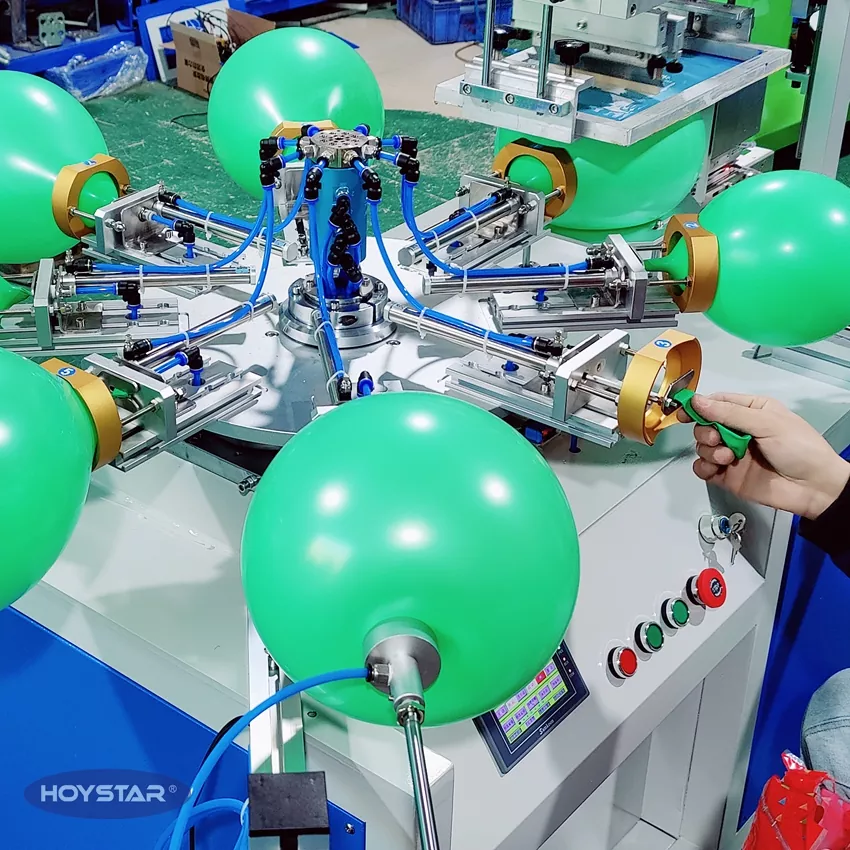 HOYSTAR - Қытайдағы сенімді өндіруші және жеткізуші; Бұл HOYSTAR бір түсті латексті шар экранды басып шығару машинасы латекс шарларында басып шығаруға арналған. Айналмалы үстел, автоматты үрлеу, автоматты айналдыру, автоматты кептіру, автоматты түсіру функцияларымен жабдықталған. PLC сенсорлық экранды басқару, қауіпсіз, интуитивті жұмыс үшін ыңғайлы интерфейс. Құрылғы жылдамдықты, дәлдікті және пайдаланудың қарапайымдылығын біріктіреді.